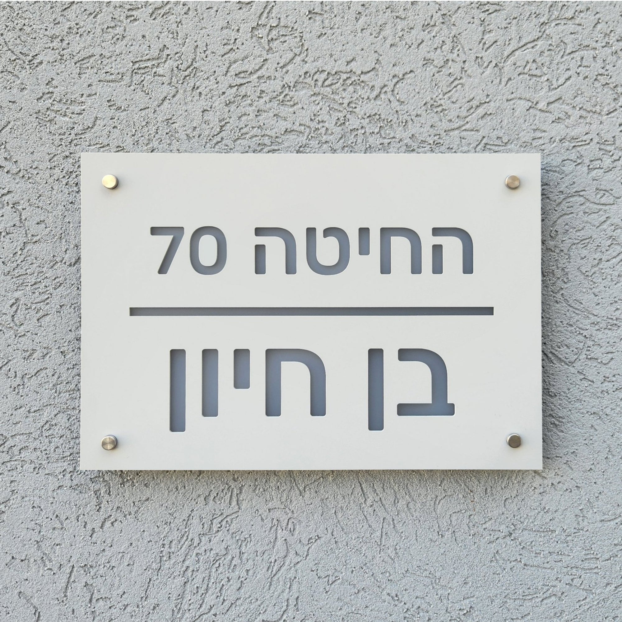 שלט שם משפחה ומספר רחוב לבית פרטי בצבע אפור בהיר דמוי בטון עם חיתוך אותיות ורקע לבחירה