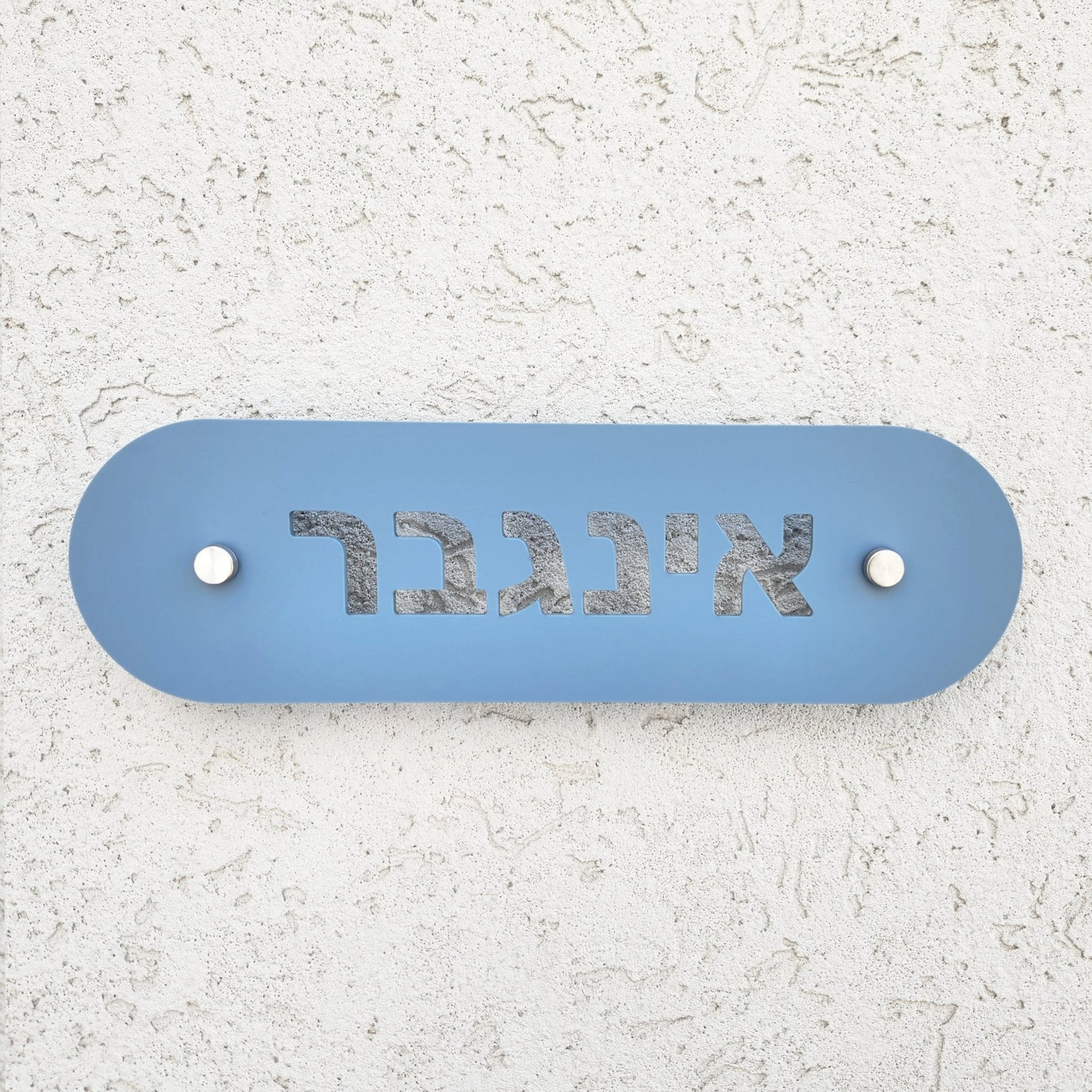 שלט שם משפחה לבית פרטי בצבע תכלת מט עם חיתוך אותיות ורקע לבחירה - צורה אובלית