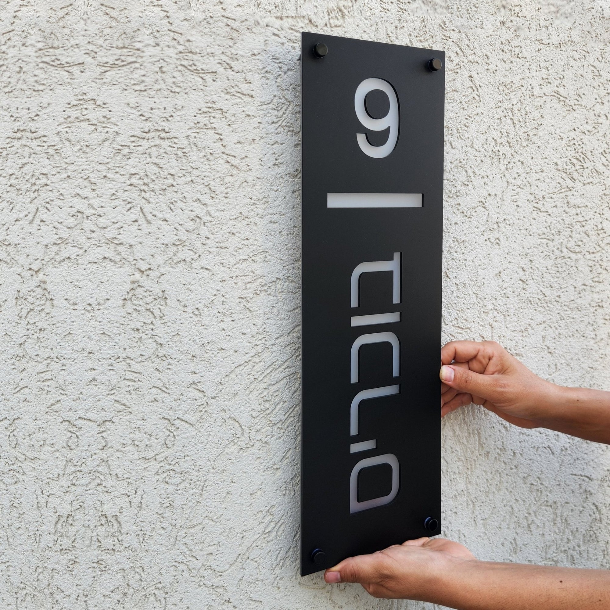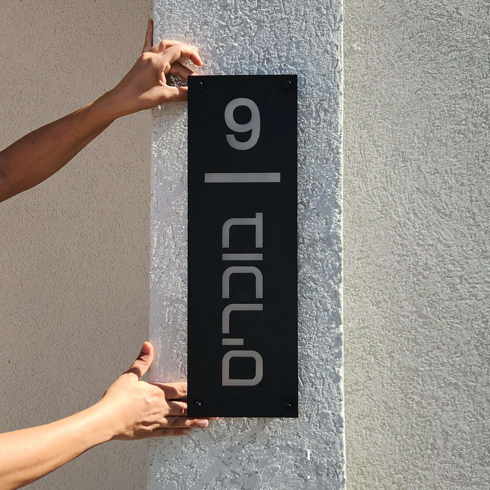 שלט שם משפחה ומספר רחוב לבית פרטי בצבע שחור מט עם חיתוך אותיות ורקע לבחירה - צר אנכי