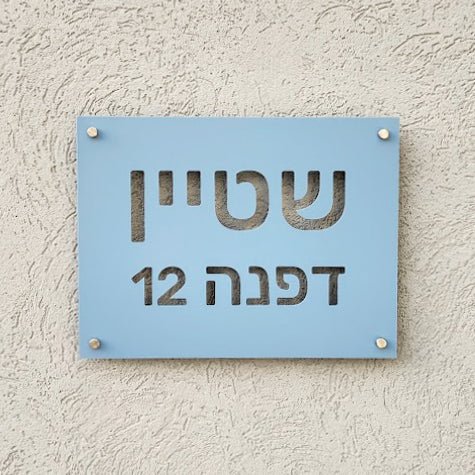שלט שם משפחה ומספר רחוב לבית פרטי בצבע תכלת אפור מט עם חיתוך אותיות ורקע לבחירה