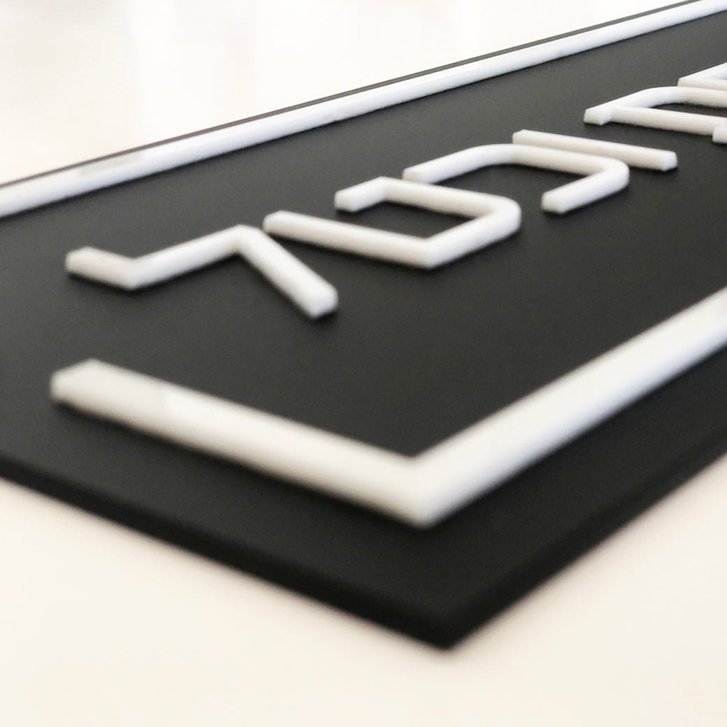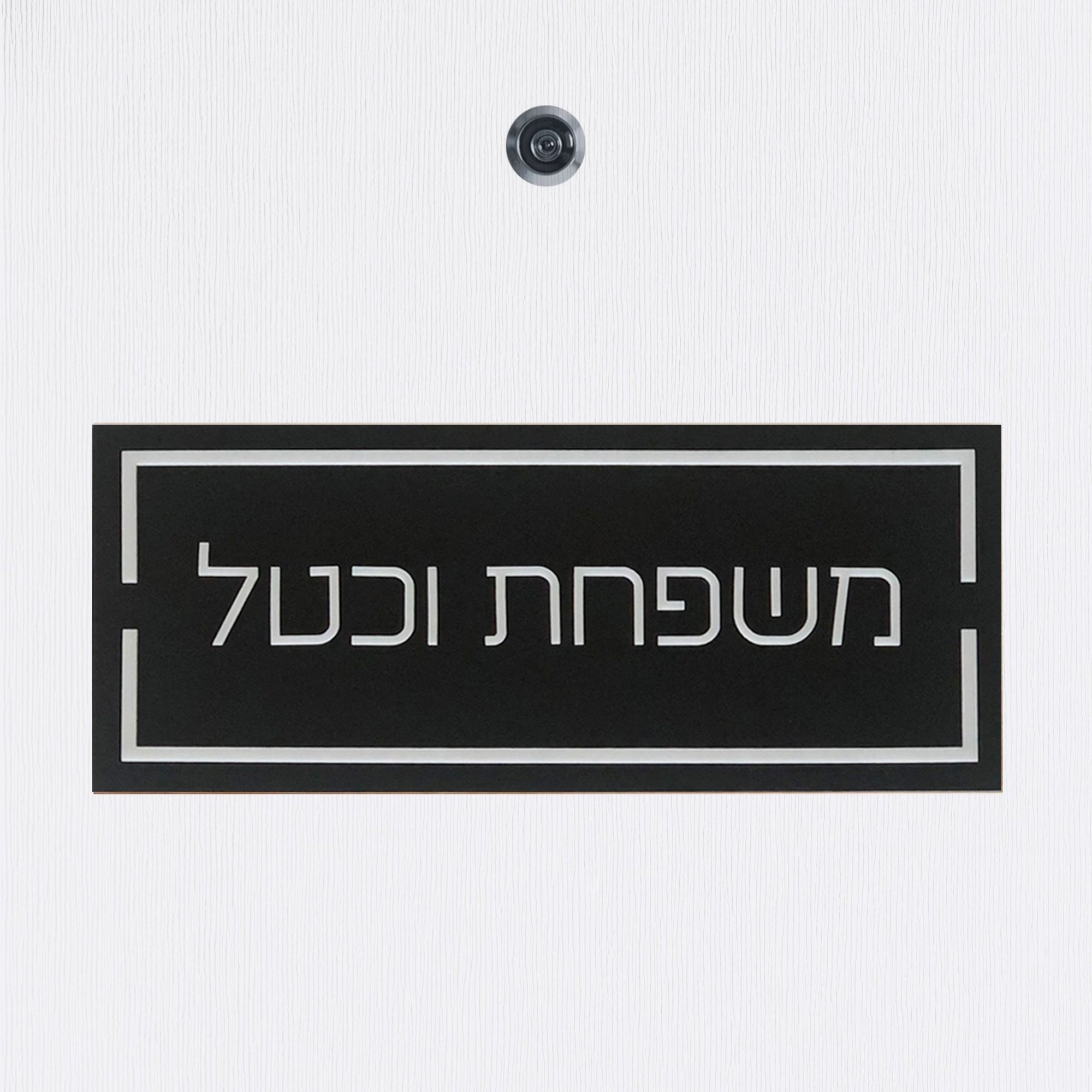 שלט שם משפחה בצבע שחור מט עם אותיות בולטות בצבע לבן ומסגרת
