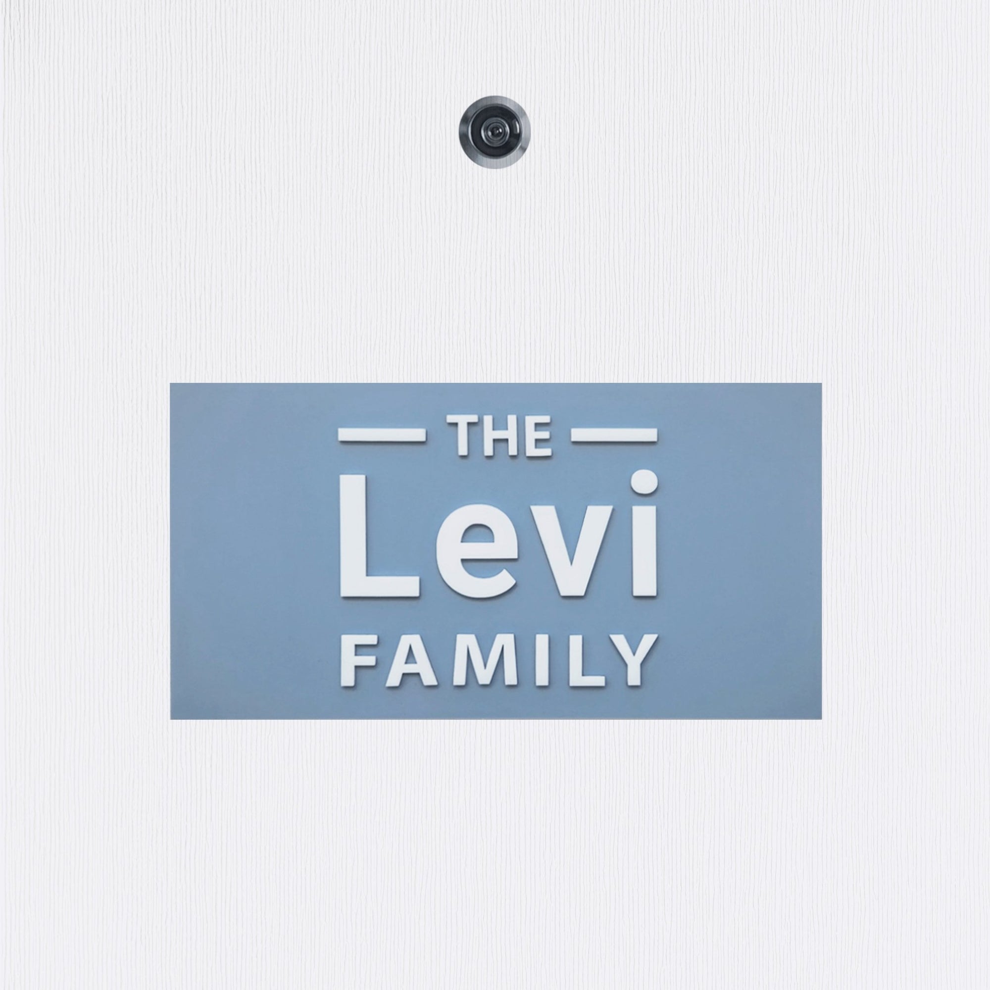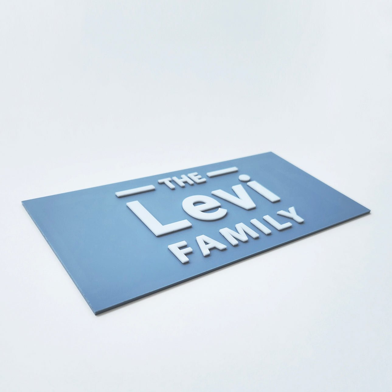 שלט שם משפחה בצבע תכלת אפור מט עם אותיות בולטות בצבע לבן וכיתוב באנגלית