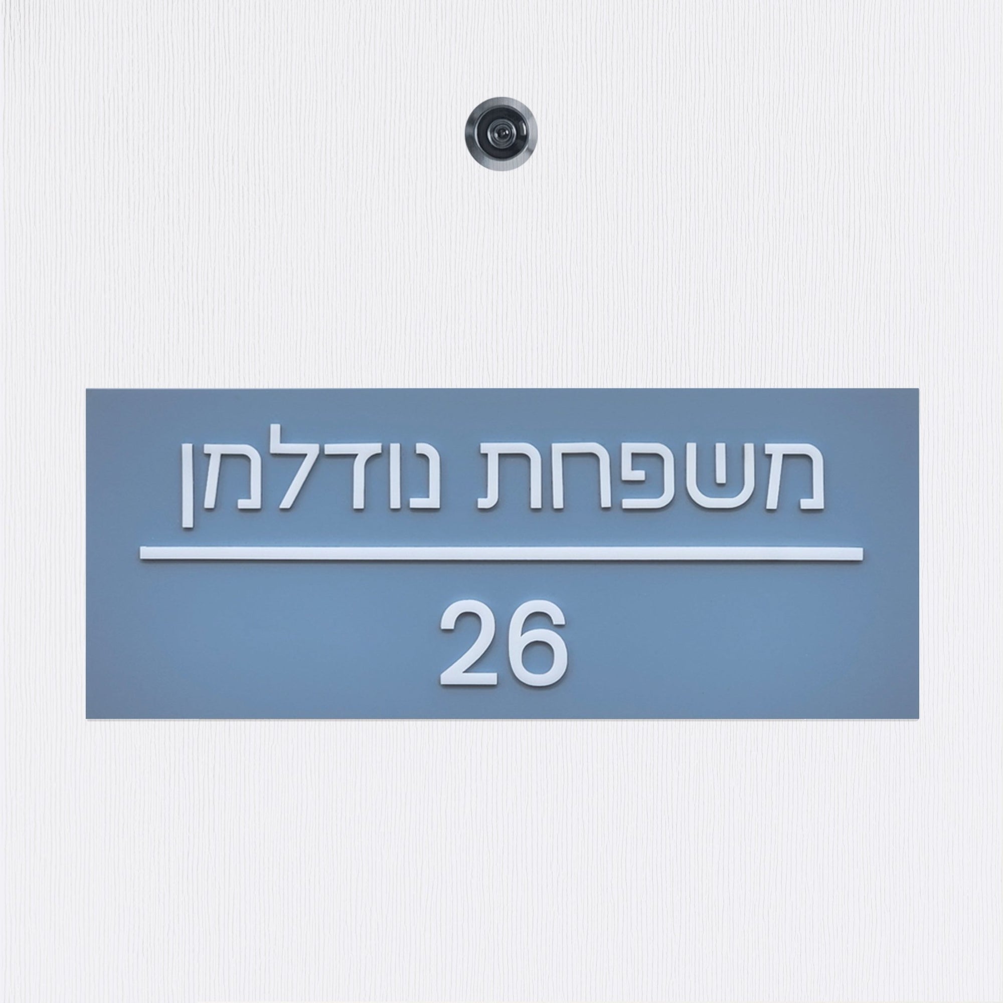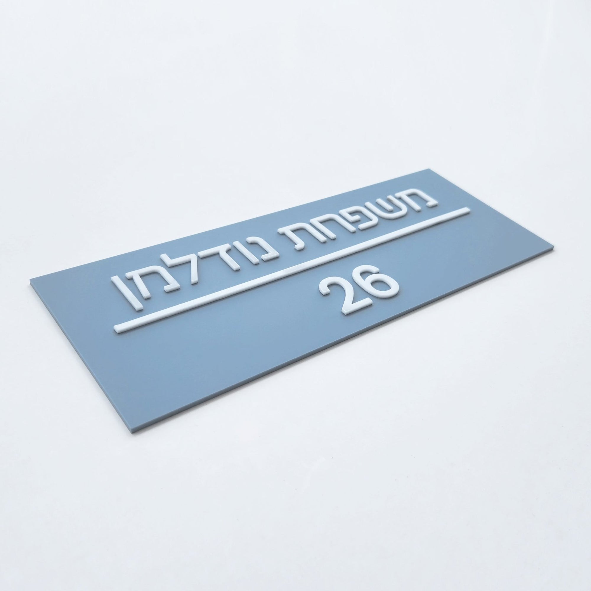 שלט שם משפחה ומספר דירה בצבע תכלת אפור מט עם אותיות בולטות בצבע לבן