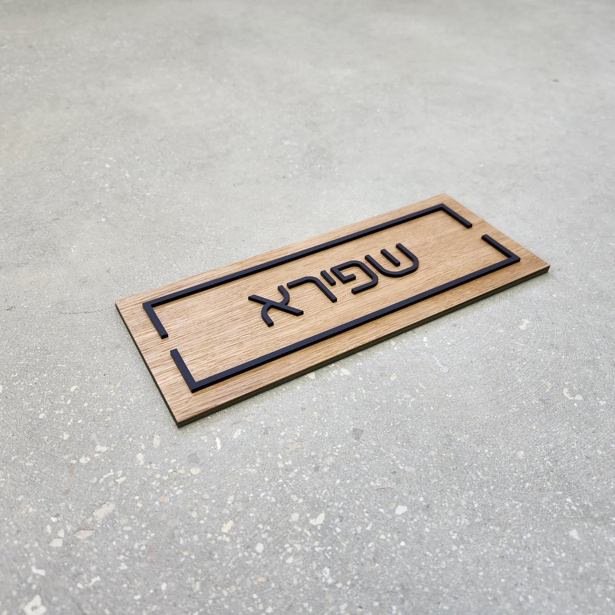 שלט שם משפחה מעץ עם אותיות בולטות בצבע שחור ומסגרת