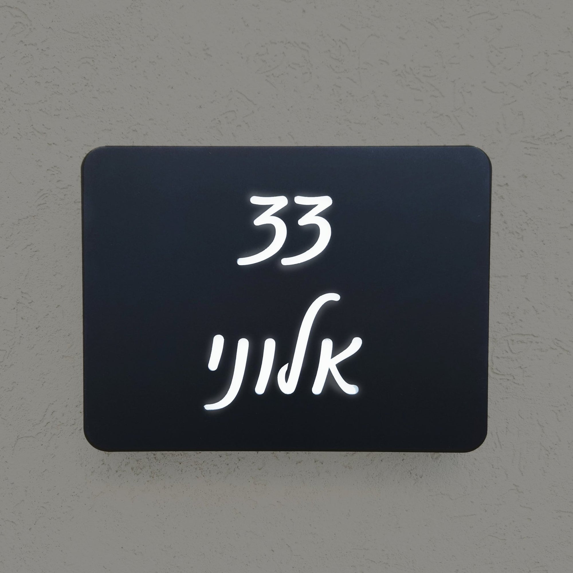 שלט מואר שם משפחה ומספר רחוב לבית פרטי עם תאורה ומנגנון כיבוי אוטומטי ביום - צבע שחור מט