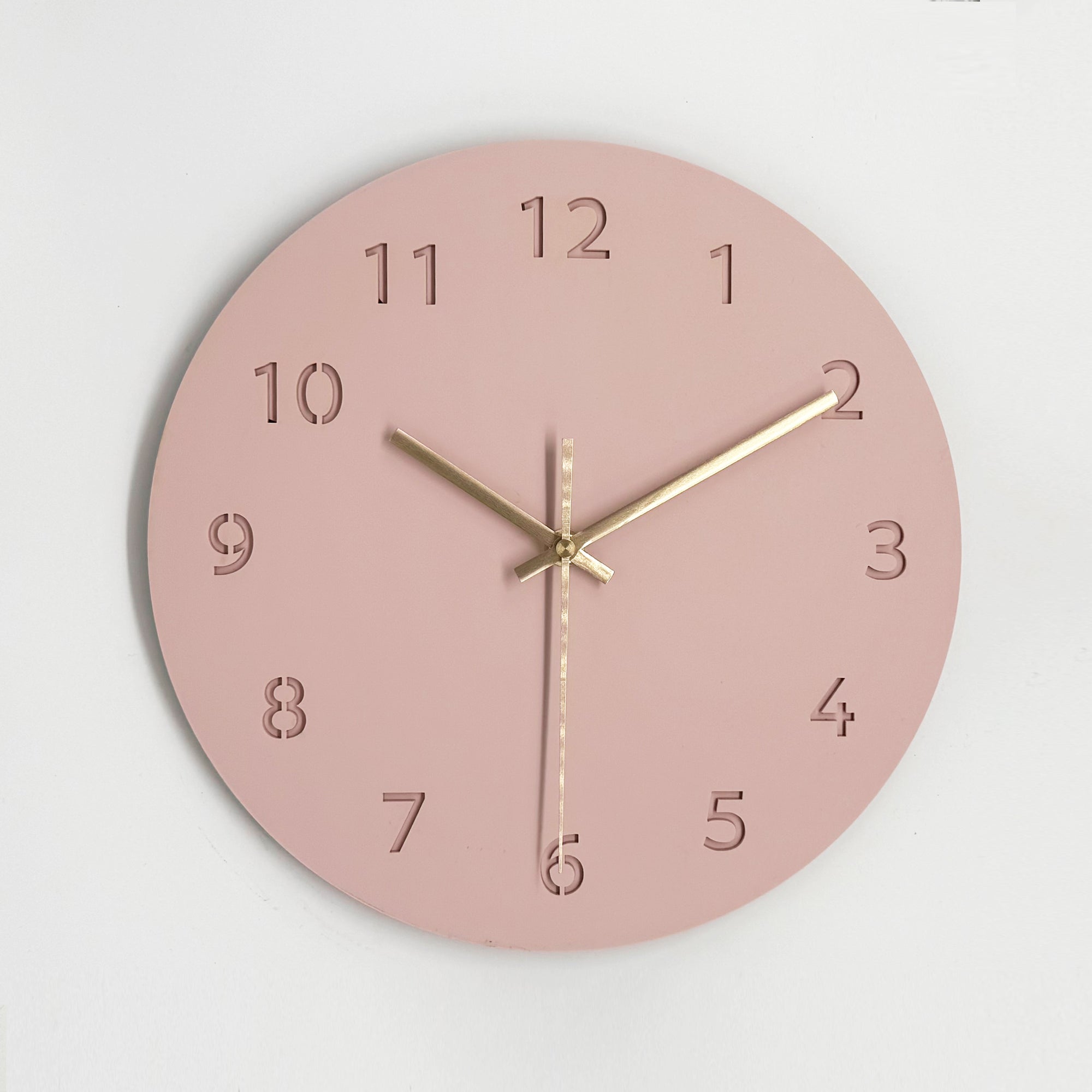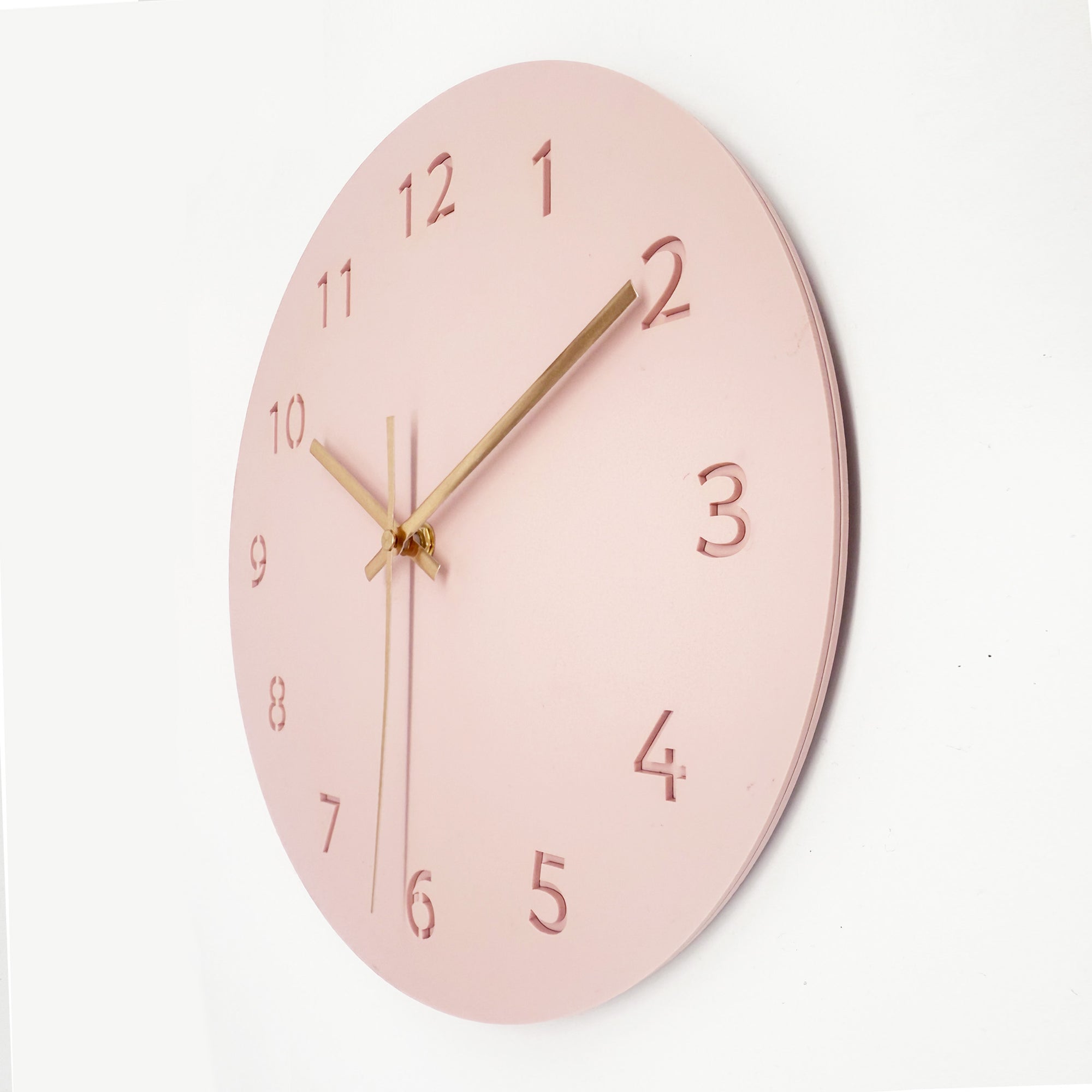 שעון קיר לבית בעיצוב מינימליסטי בצבע ורוד מט עם מספרים שקועים