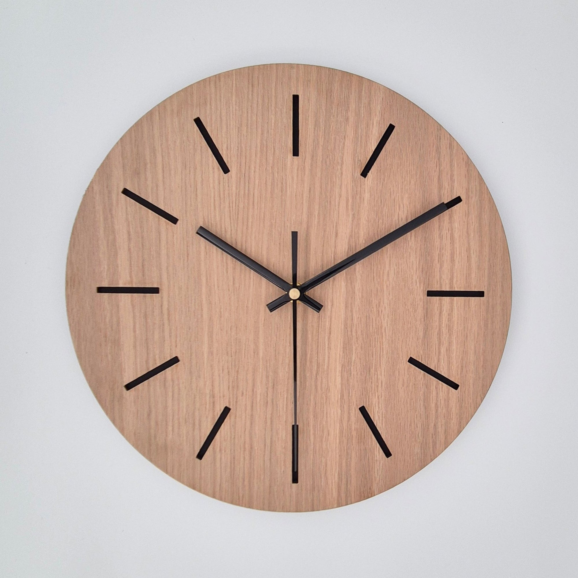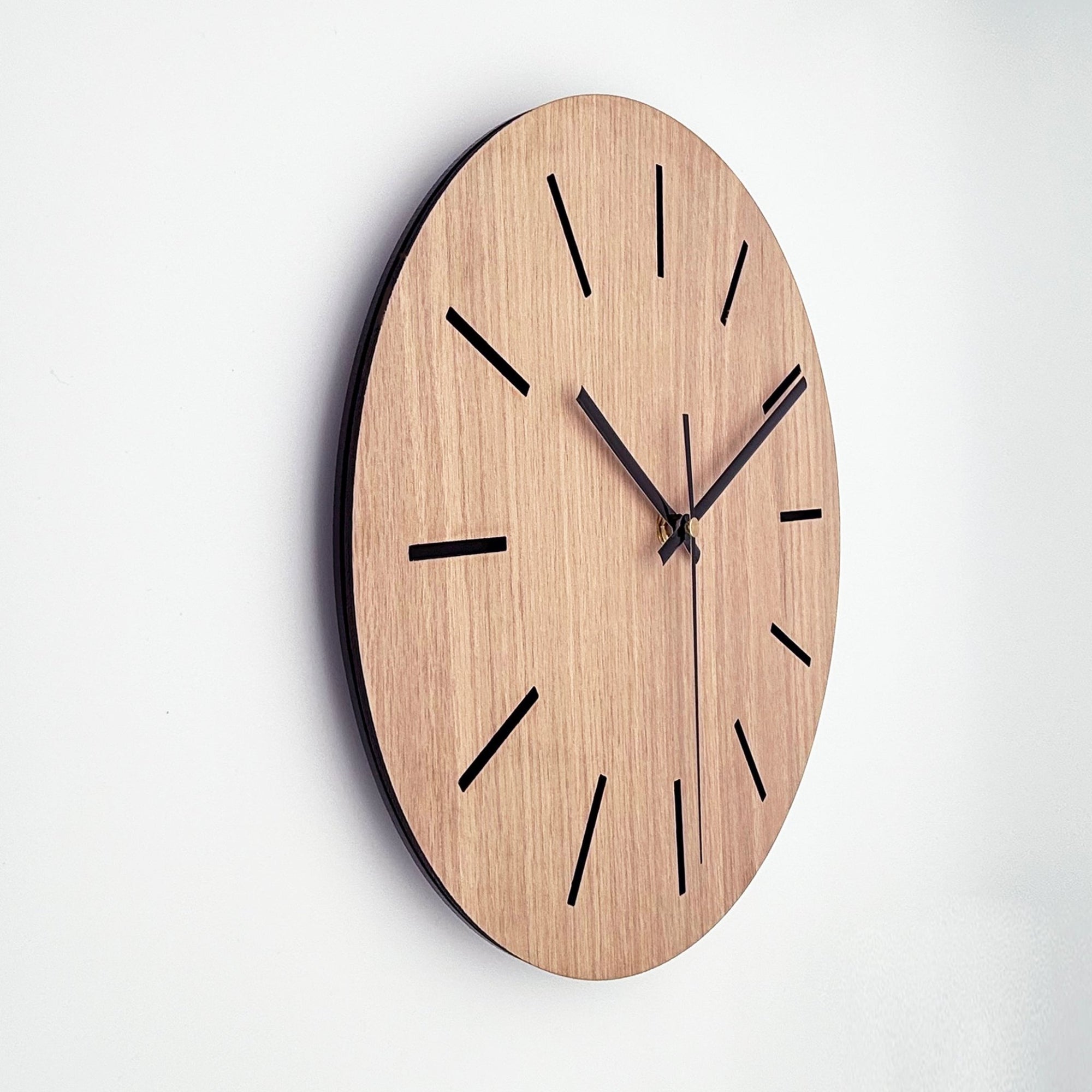 שעון קיר לבית בעיצוב מינימליסטי מעץ אלון עם קוים שקועים בצבע שחור מט